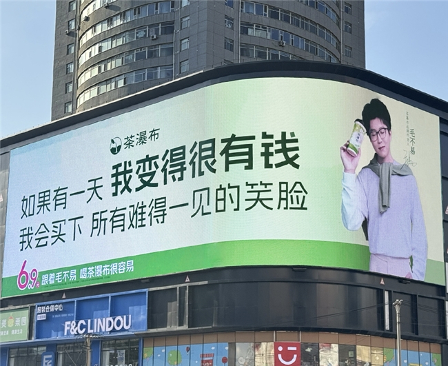 为迎接代言人毛不易,茶瀑布在全国20余座核心城市的地标商圈及交通枢纽同步上线巨幅广告。这些户外大屏不仅官宣合作,更巧妙融入毛不易的经典歌词,将治愈力量传递给每一位过往路人,强化品牌温暖形象。