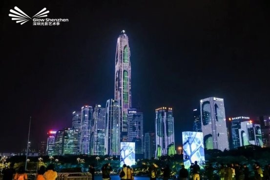 ▲2023年「光合创想」:福田中心区43栋标志性楼宇的主题灯光表演,打造了270°超宽视野的"天际屏幕"。