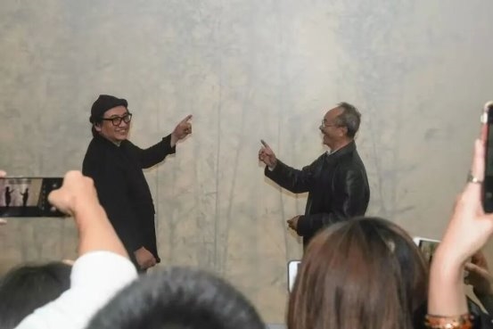 ▲2019年《共时》开幕式,策展人李振华与艺术家吕胜中老师(1952年-2022年)在作品《山水书房》前的留影。