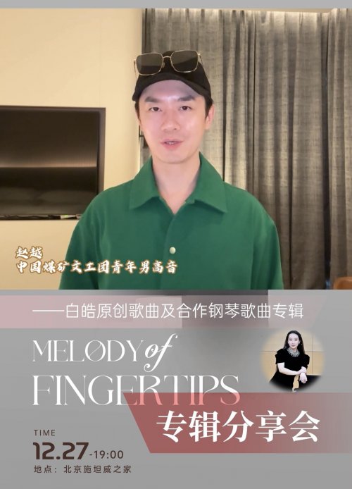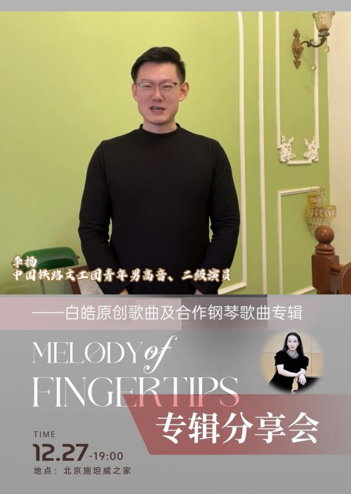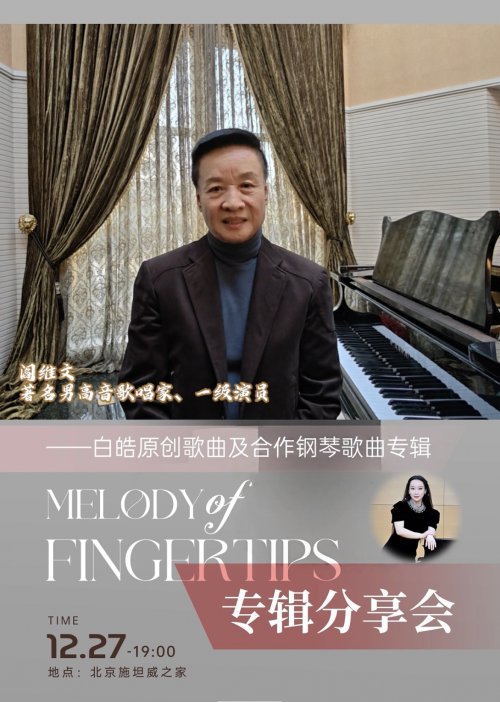 12月27日19时,合作钢琴家白皓将携原创专辑《指尖的旋律》在北京施坦威之家举办专辑分享会,现场呈现其原创歌曲及合作钢琴歌曲作品,多位特邀艺术家将同台助阵。