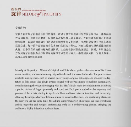 作为中国音乐学院声歌系钢琴艺术指导、国家大剧院艺术沙龙特邀讲师、“施坦威”钢琴大赛评委,白皓老师此次推出的《指尖的旋律——白皓原创歌曲及合作钢琴歌曲专辑》,收录了《西湖美》《钗头凤·红酥手》《夏夜,在河边》《竹枝词》等16首作品,这张专辑汇聚了白皓音乐创作的精华,体裁涵盖古诗词歌曲、原创艺术歌曲、民歌创新改编等多元音乐体裁。