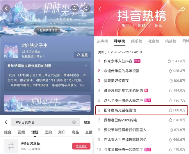 活动上线后#护肤尖子生 #冬日灵冻岛 #把年度高光留在雪地 相关话题上线,带动海量用户参与讨论与二创,抖音站内刮起了一阵强劲的“布灵布灵的冰雪美学”之风。截至目前,话题#护肤尖子生 累计播放量达26.4亿次,#把年度高光留在雪地 登上抖音种草榜TOP6 ,实现品牌声量与冰雪美学趋势的双重爆发。