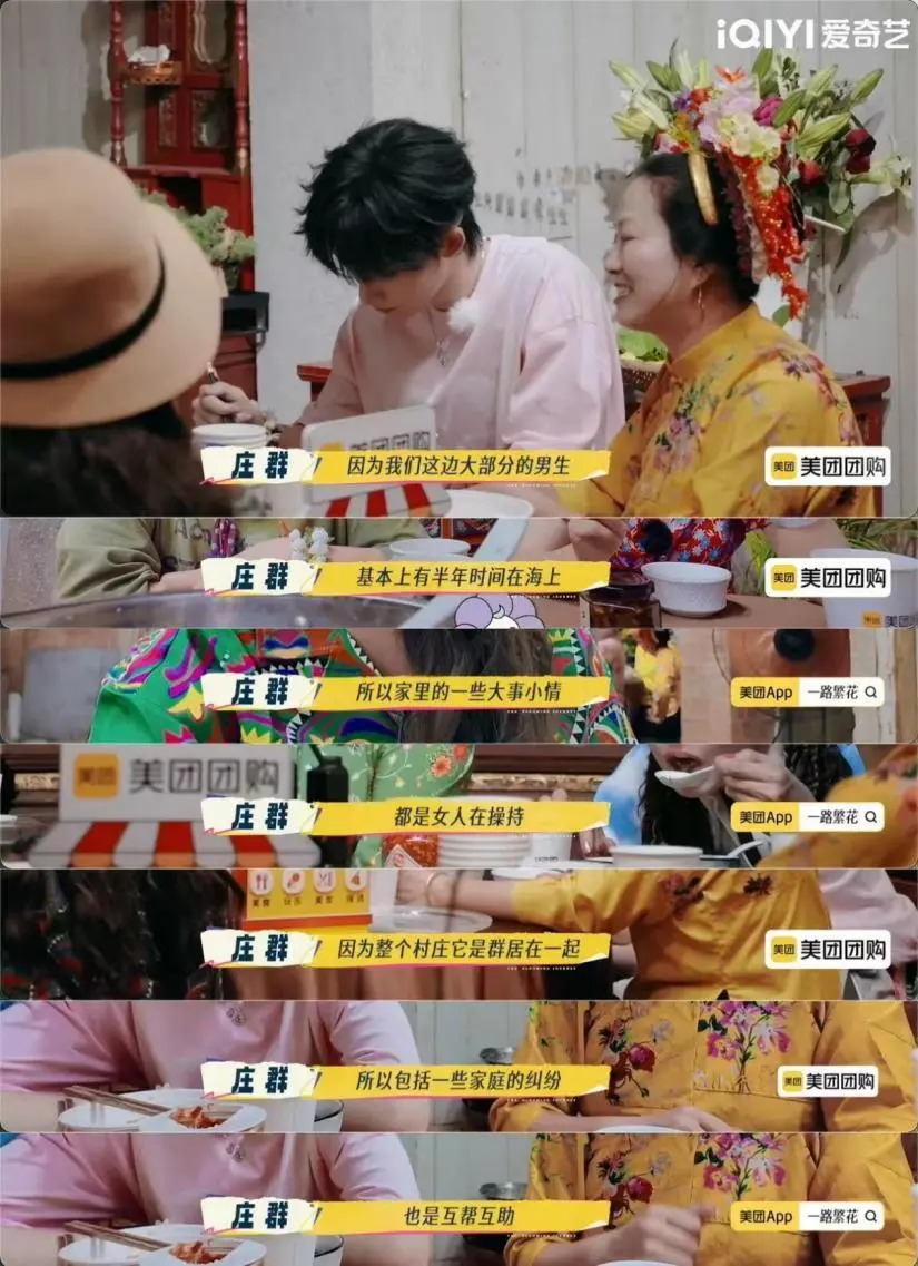 来到蟳埔村,繁花团也入乡随俗,默契分工洗菜、备菜、掌勺,联手烹制了一桌充满烟火气息的温馨家宴。繁花团与当地渔女围坐共餐,认真聆听蟳埔女性自强不息的生活故事:由于丈夫常年随船出海,全家生计、养育子女、维系邻里等等大小事务都由女人一手操持。当一家有难,整村女性会自发帮忙照看孩子、凑钱应急、调解矛盾——像这样在世代传承中形成的互助网络,是当地女性在结构性缺席中自我组织、彼此托底的生存智慧,也让观众看到传统社会中女性群体的内在力量与强大韧性。