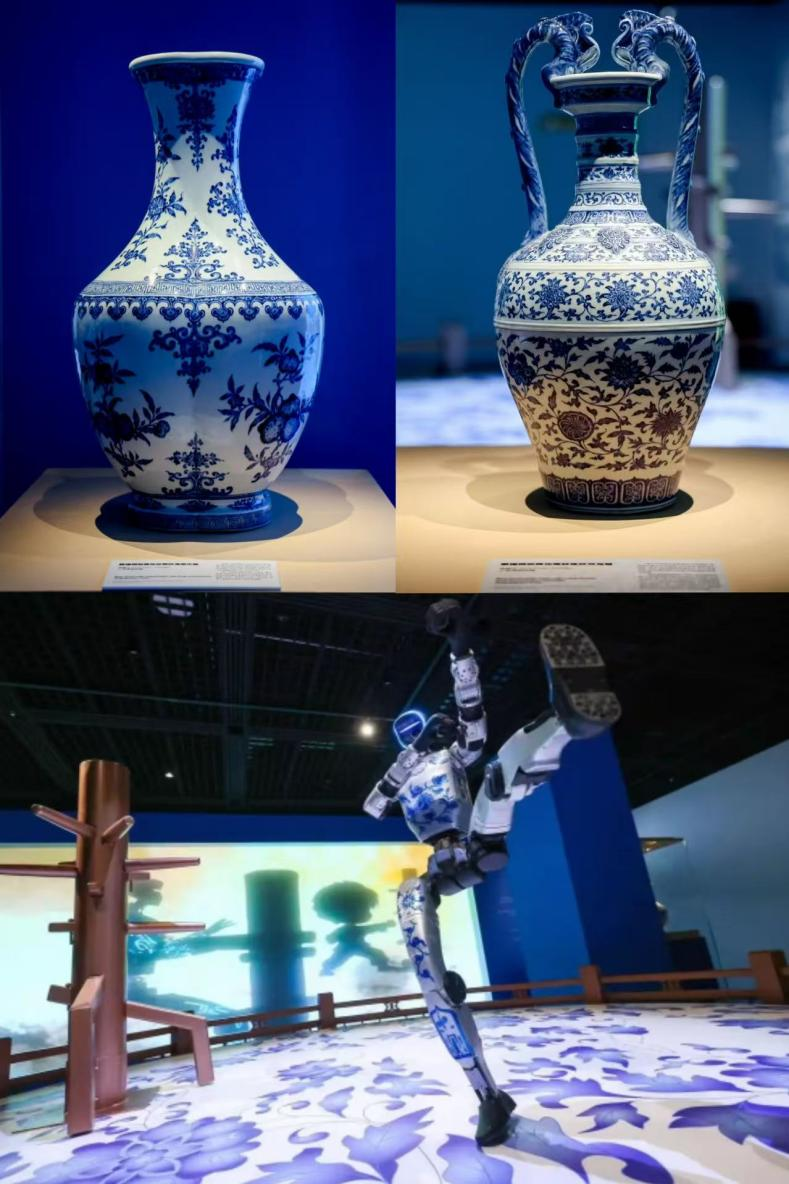 本次艺术秀并非将文物和IP简单罗列,而是真正让它们实现“对话”。 比如将四千多年前的“玉神人”,通过潮流转译,变成一个戴着未来感冠帽的“周同学”巨像投影,在“玉见未来”的未来考古概念展区展现中国玉石之美;将大克鼎的元素融入铠甲设计里,在“青铜跨时代”展区,青铜卫士周同学将守护着老祖宗的文化宝藏,古钱币造型创造出的10000张数字艺术收藏卡也将串联起古今未来对生活富足的美好期待;在“青花武馆”展区,上海博物馆馆藏的景德镇窑青花缠枝莲纹双耳瓶、景德镇窑青花折枝山茶纹扁壶等珍品悉数亮相,身绘青花瓷纹样的功夫机器人站上擂台,以灵动姿态演绎传统武术魅力,让非遗匠心与科技活力相融;“粉彩浪漫”展区则与周杰伦钟爱的粉色结合,聚焦清代乾隆年间的景德镇窑粉彩堆塑婴戏瓶、粉彩莲纹盖碗等粉彩珍品,让观众穿越时空,对话粉色浪漫。这些设计让沉默的文物生动叙事,激发跨越时空的情感共鸣。此外,艺术秀还设有丰富的互动体验,观众可参与文物修复VR体验,沉浸式感受修复技艺的魅力。