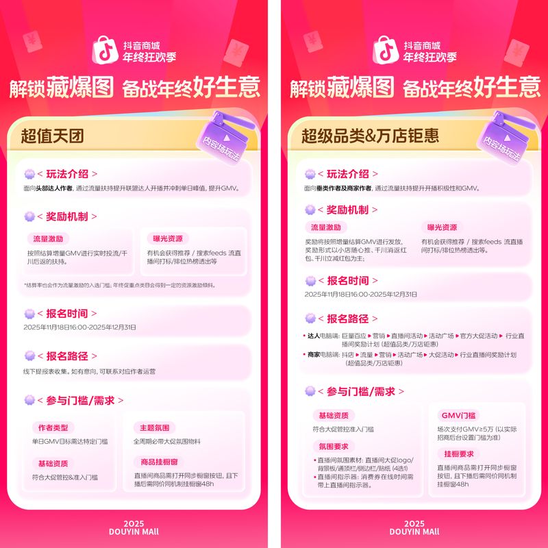 承接双11大促的强劲势头,「2025抖音商城年终狂欢季」招商正火热进行中,并于12月3日正式开启年终促活动。商家、达人可紧跟平台节奏,参与大促玩法,借力平台扶持,抢先布局蓄水,打赢全年收官之战。