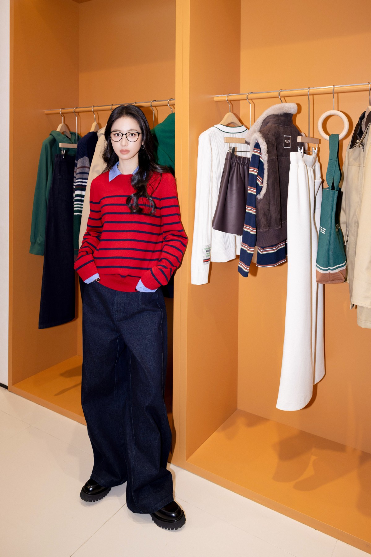 快闪以「此刻诗篇」为主题,通过叙事化灵感,将复古主义、极简经典、趣味时尚与摩登文化交织共生,共构出兼容并蓄的多元场域。周雨彤身穿PSALTER诗篇2025冬日新品亮相现场,蓝色衬衫与红色条纹毛衫的巧妙叠搭,明媚点亮欢聚时刻,既书写摩登语境下的混搭美学,亦流露书卷气息中蕴藏的智性姿态,恰如其分地诠释了品牌的内核。
