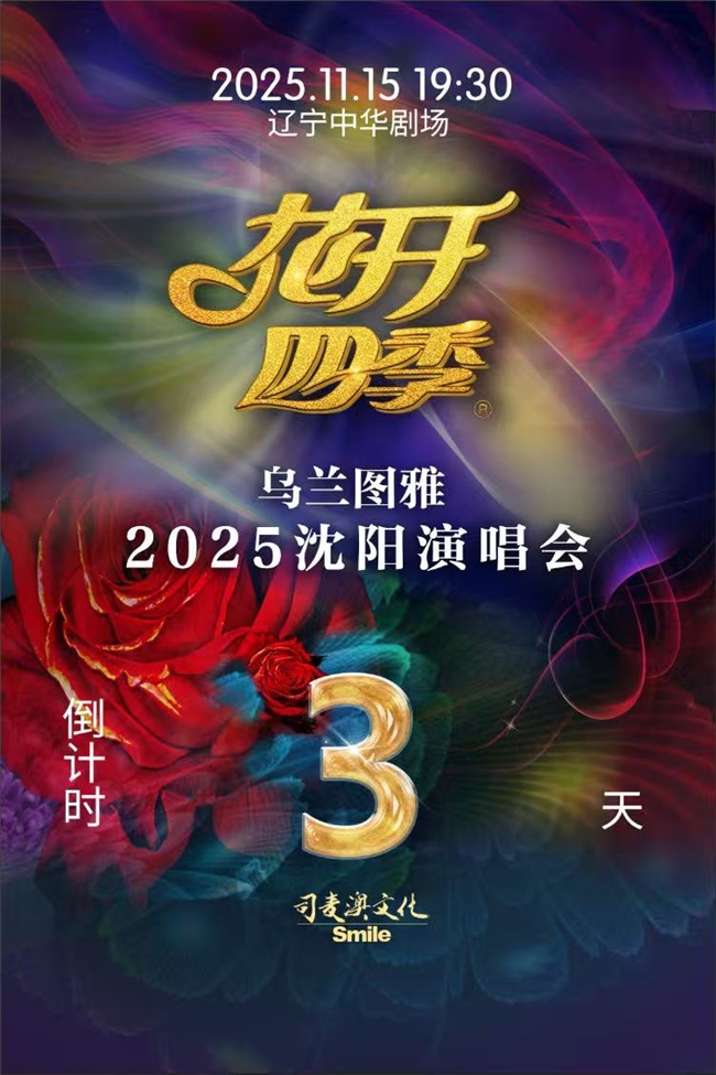 11月15日19:30,相约辽宁中华剧场,共赴这场 “花开四季” 的音乐之约,让我们手握荧光棒,在乌兰图雅的歌声中拥抱初冬暖阳,共同感受草原的辽阔与盛京的豪迈在旋律中绽放永恒光彩!