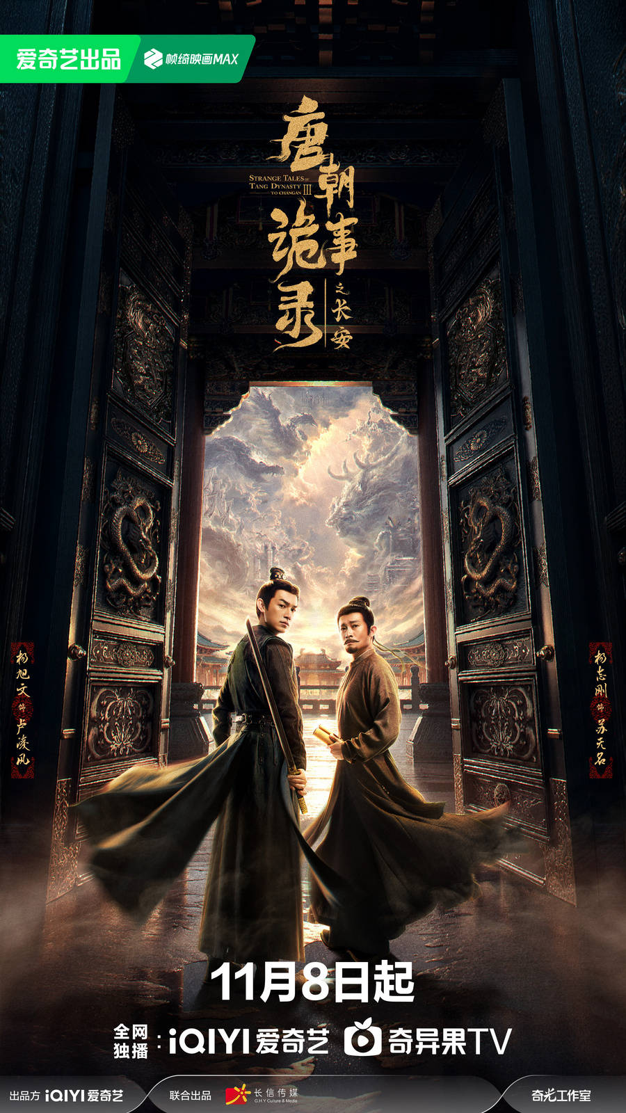 由北京爱奇艺科技有限公司出品,北京长信影视传媒有限公司联合出品,郭靖宇、柏杉监制,魏风华、郭靖宇编剧,巨兴茂担任总导演,郭世民执导,杨旭文、杨志刚领衔主演,郜思雯、陈创、孙雪宁、石悦安鑫主演,岳丽娜、刘智扬特别出演的古装悬疑探案剧《唐朝诡事录之长安》11月8日起爱奇艺全网独播,北京卫视品质剧场每晚19:30播出。该剧讲述了卢凌风与苏无名西行结束之后,回到风云变幻的长安,以身入局,甘为棋子,在天子与长公主权力的角逐中,再次秉持正义与良善的初心,深入长安各处,勘破诡案,守护百姓的故事。