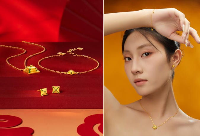 万春纳福系列“星檐”足金饰品套装:包含项链、耳饰、手链三件套,设计灵感来自万春亭的“三重檐四角攒尖顶”。以俯瞰视角提炼建筑的对称美学,将檐角的弧度转化为首饰的线条,套装整体简约大气,既能日常佩戴,又暗藏对古都建筑文化的致敬。