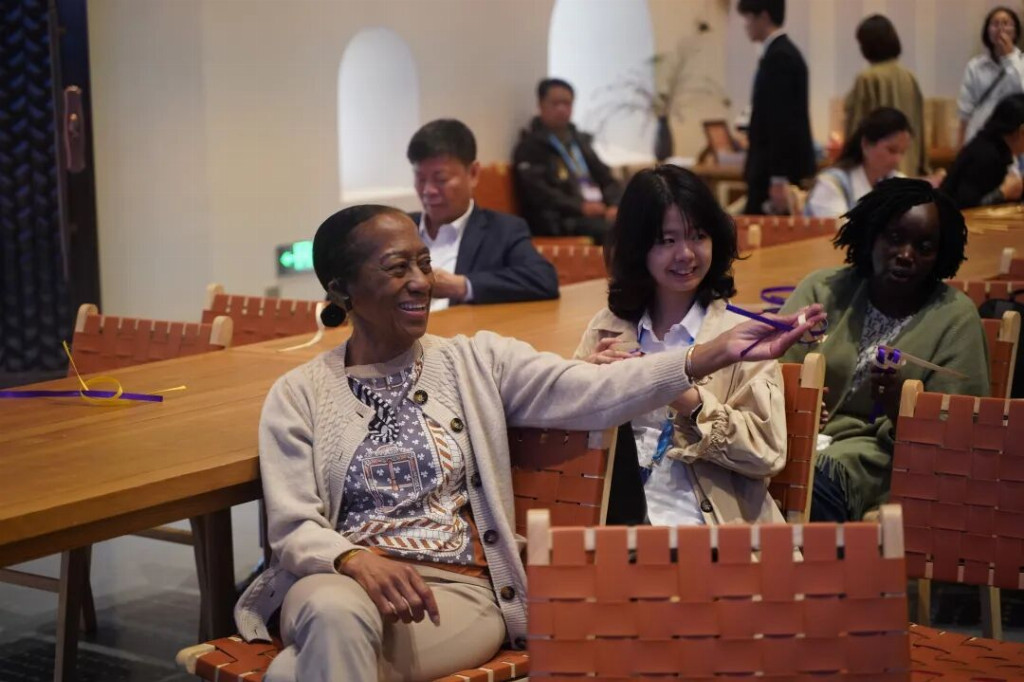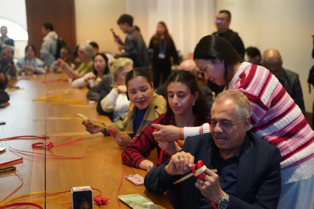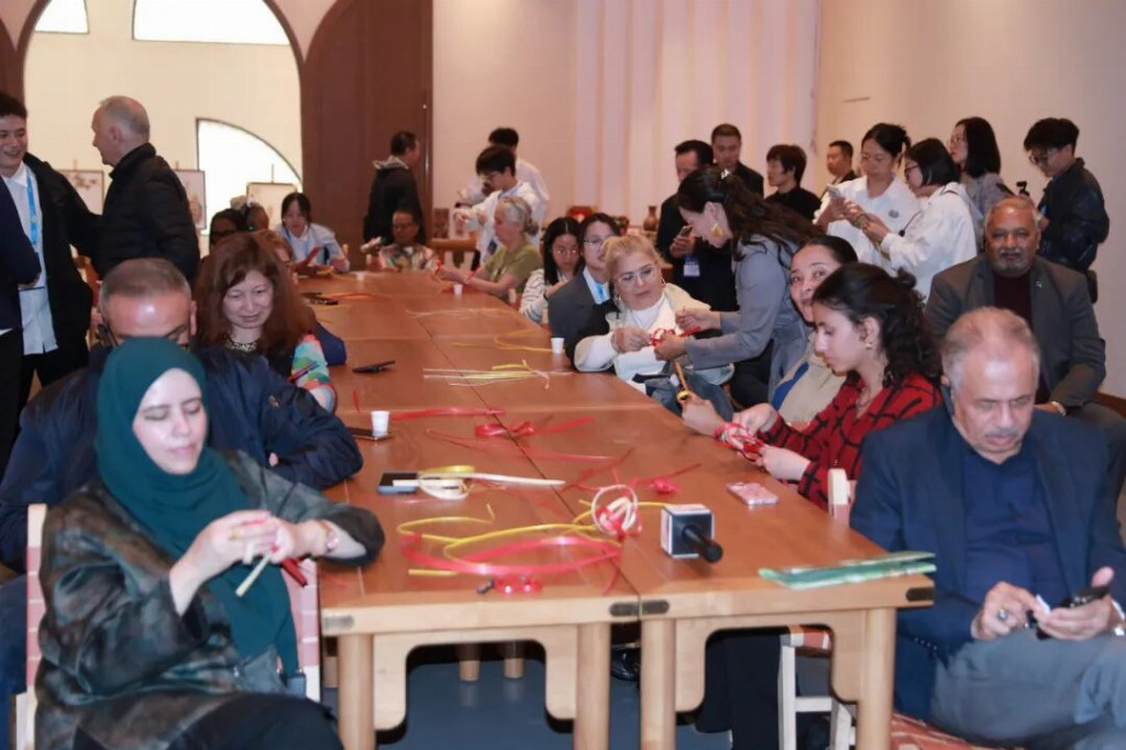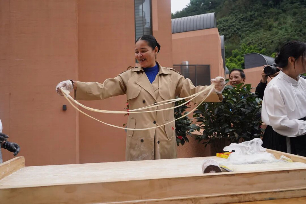 村落里的非遗展示更添惊喜:周公山竹编传承人陈升焕用两根40厘米竹片,经“绕、挑、压、编”几个动作,转眼就制成一条“竹鱼”,驻华大使一行跟着慢动作尝试;非遗笋壳烙画传承人李学琴手持烙铁,在普通笋壳上“画”出雨城的青山、绿水与熊猫,让驻华大使一行连连惊叹“这是指尖上的非遗奇迹”。