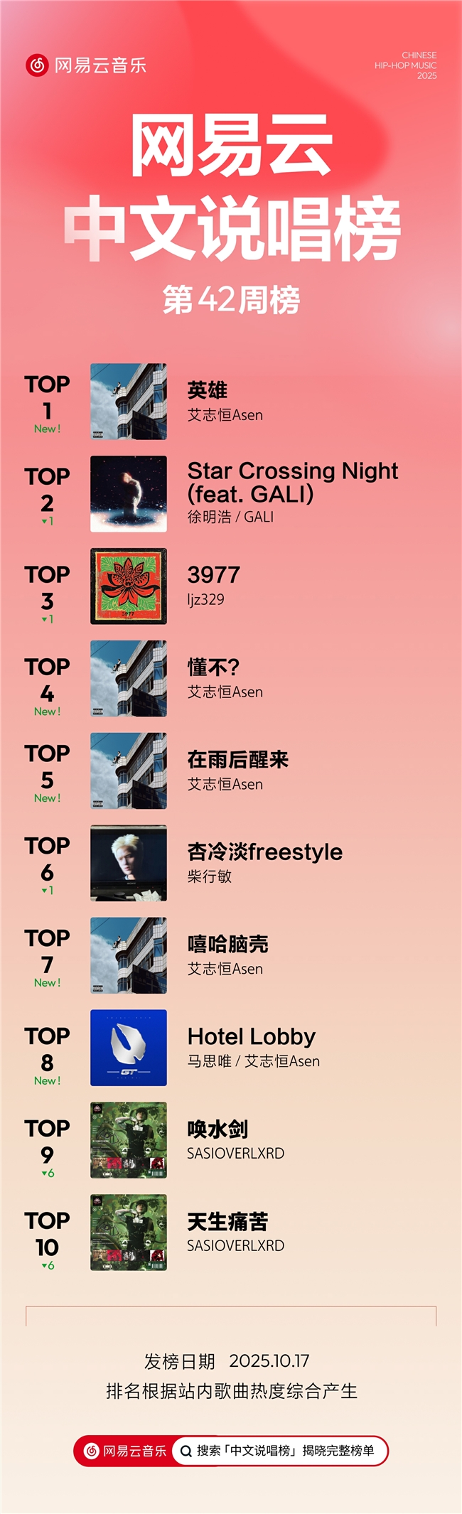 10月17日,网易云音乐发布2025年第42期说唱周榜。中文说唱榜方面,本周多位歌手发布新专辑。艾志恒Asen新专《在雨后醒来》以深度的自我剖析引发共鸣,激起了中文说唱乐迷的广泛讨论,《英雄》空降榜首,《懂不?》《在雨后醒来》《嘻哈脑壳》闯入榜单前十;马思唯发布了前专《乐透人生》的第二篇章《乐透人生GT:即刻入戏》,同样表现亮眼,《马师》《曼巴Flow》《T0》《娱公移山》等多首歌曲上榜,与艾志恒Asen合作的《Hotel Lobby》位居榜单第八位。此外,徐明浩GALI《Star Crossing Night》依旧强势,暂列第二;SASIOVERLXRD《唤水剑》《天生痛苦》持续发酵,稳居前十。