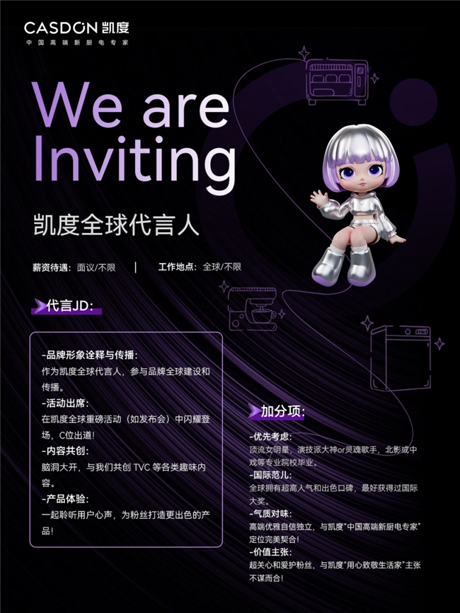 近日,厨电圈的一则特殊“招聘启事”成功破圈,引发了社交媒体和职场平台的双重热议。10月11日,中国高端新厨电专家品牌凯度电器,在其官方微博及猎聘、BOSS直聘等专业平台,正式发布了一则“全球代言人”招聘信息。不走寻常路的“云面试”模式和极具指向性的“职位要求”,让这则招聘迅速发酵,从一次品牌官宣事件,升级为全民参与的热点话题。