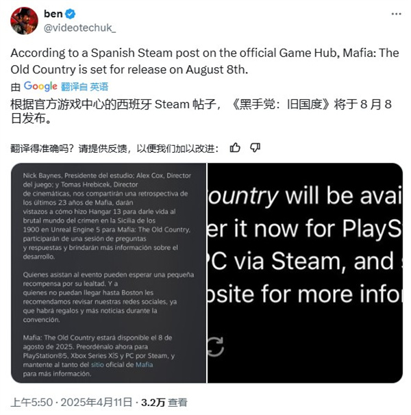 四海兄弟新作《四海兄弟:故乡》的发售日期似乎被意外泄露。2K 与 Hangar 13 在 Steam 宣传 PAX East 游戏展专题活动时,在其博文中透漏该作将于 8 月 8 日正式推出,虽然该日期在文中已被删除,但仍被 Gematsu 第一时间截图保存。
