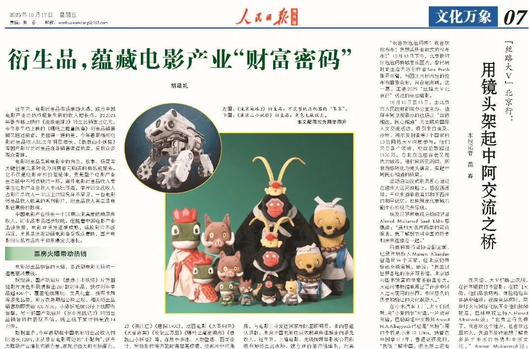 2025年10月17日,人民日报海外版07版头条刊发本文作者撰写的有关国产电影衍生品热销现象的文章。