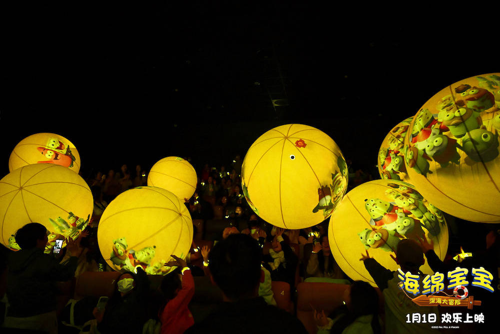 为打造沉浸式观影体验,影片放映前后更是准备了特别互动环节。检票前影院大厅突然响起了乐队与合唱团现场演绎的海绵宝宝经典主题曲,海绵宝宝和派大星也在现场为快乐应援,当“是谁住在深海的大菠萝里”这一熟悉的歌词响起,观众们纷纷给出热情回应,许多人情不自禁跟唱并举手机记录,现场充满怀旧而欢快的气氛。映后惊喜更是重磅,数十余个大型发光气球随片尾音乐同步点亮向观众席抛去,观众在主持人的引导下开启荧光手环,整个现场瞬间沉浸在一片温暖的黄色光海中。在传递气球、挥舞手环的过程中,现场笑声欢呼声交替,不少观众离场时仍意犹未尽。
