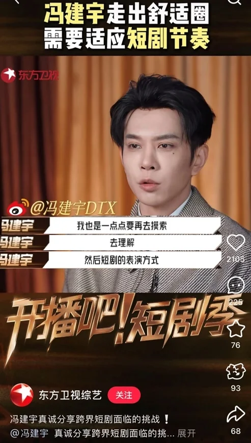 “你不是天生丽质,但你可以天生励志!”在综艺《开播吧!短剧季》的喊话环节,冯建宇这样对自己说。