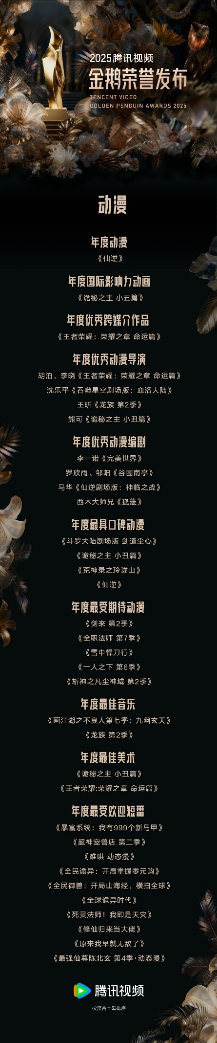 动漫方面,《王者荣耀:荣耀之章命运篇》导演胡泊、李晓,《吞噬星空剧场版:血洛大陆》导演沈乐平,《龙族第2季》导演王昕,《诡秘之主小丑篇》总导演熊可,共同荣获年度优秀动漫导演;《完美世界》编剧李一诺,《谷围南亭》编剧罗欣雨、邹阳,《仙逆剧场版:神临之战》总编剧马华,《孤雄》总编剧西木大师兄,共同荣获年度优秀动漫编剧。