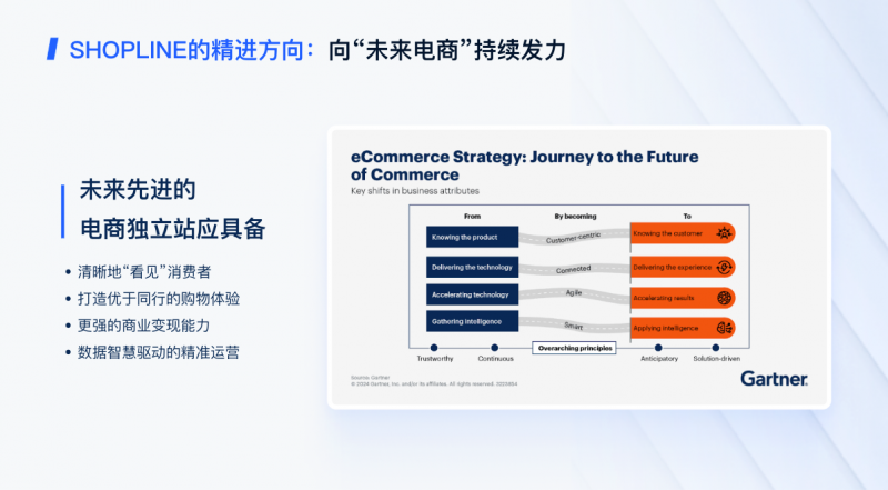 在一天高密度的思想碰撞中,生态伙伴们输出了大量前沿洞察与实战经验,获得了与会者的广泛好评与共鸣。全天的分享围绕一个关键共识展开:一个面向未来的电商独立站,必须构建四大核心能力——清晰地“看见”消费者、打造优于同行的购物体验、更强的商业变现能力,以及数据智慧驱动的精准运营  。这一观点与Gartner所定义的电商演进路径高度契合,标志着行业竞争正从“了解产品”转向“了解客户”,从“交付技术”迈向“交付体验”。