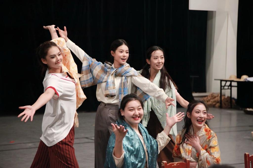 青年演员湛嘉丽在剧中一人分饰两角,其清亮婉转的嗓音与细腻精准的肢体表达,生动诠释了不同时代女性共有的坚韧与偶尔的迷茫。探班现场,湛嘉丽、刘宇希、房静、明家歆几人演唱的《女人啊女人》片段,一句“我仍旧会光芒四射”的歌词,瞬间点燃全场,引发深切共鸣。